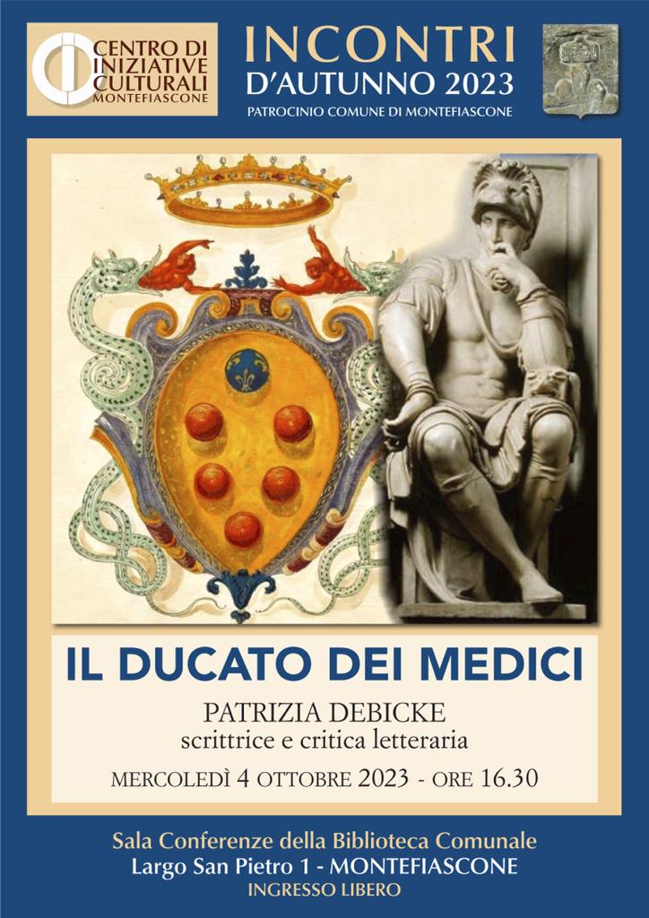Mercoledì 4 ottobre, ore 16.30, a Montefiascone (VT), Patrizia Debicke terrà un incontro su “Il ducato dei Medici”. L’evento si terrà presso la Sala Conferenze della Biblioteca Comunale, Largo San... Leggi tutto