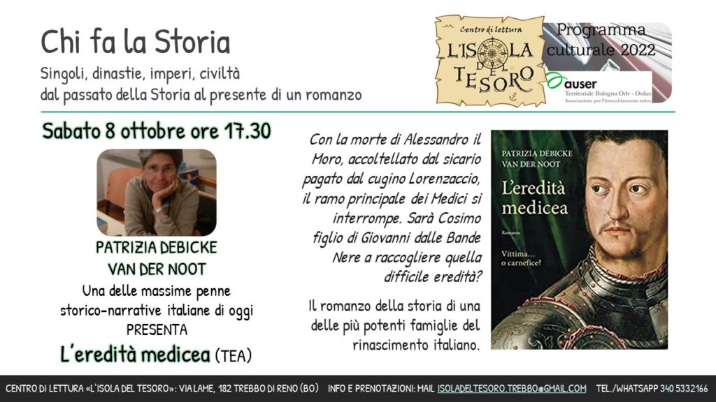 Sabato 8 ottobre, ore 17.30, a Trebbo del Reno (BO), presso il centro di lettura L’Isola del Tesoro, nell’ambito della rassegna AUTori di AUTunno, presenterò il mio libro “L’eredità medicea”,... Leggi tutto