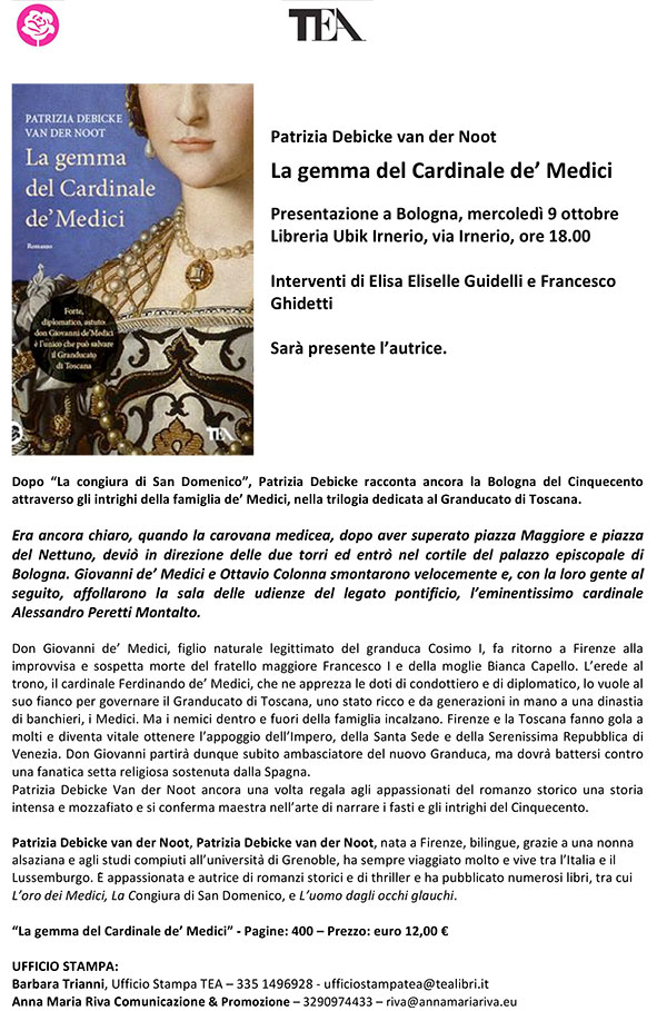 Martedi 3 marzo a Firenze, alle h 19 presso il Circolo dell’Unione (via dè Tornabuoni 7; ammessi solo Soci ed invitati) presenterò La gemma del Cardinale dè Medici, Ed. TEA.... Leggi tutto
