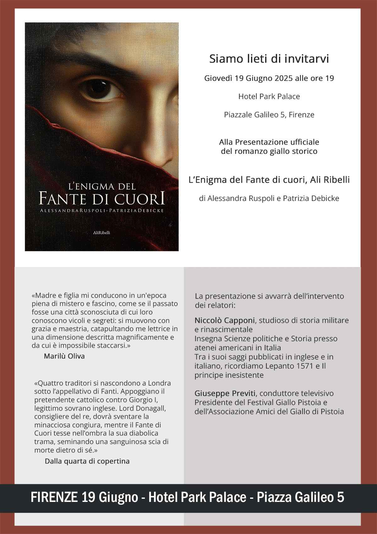 Firenze – Siamo lieti di annunciare la presentazione ufficiale del romanzo giallo storico L’Enigma del Fante di cuori, edito da Ali Ribelli, scritto dalle autrici Alessandra Ruspoli e Patrizia Debicke.