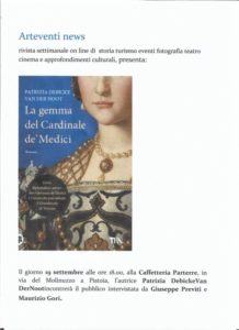 il 19 settembre a Pistoia al Bar Caffè Letterario Parterre via del Molinuzzo, 7 di La gemma del cardinale de’ Medici TEA di patrizia debicke promossa da Arti Eventi News intervengono Giuseppe Previti e Maurizio Gori.
